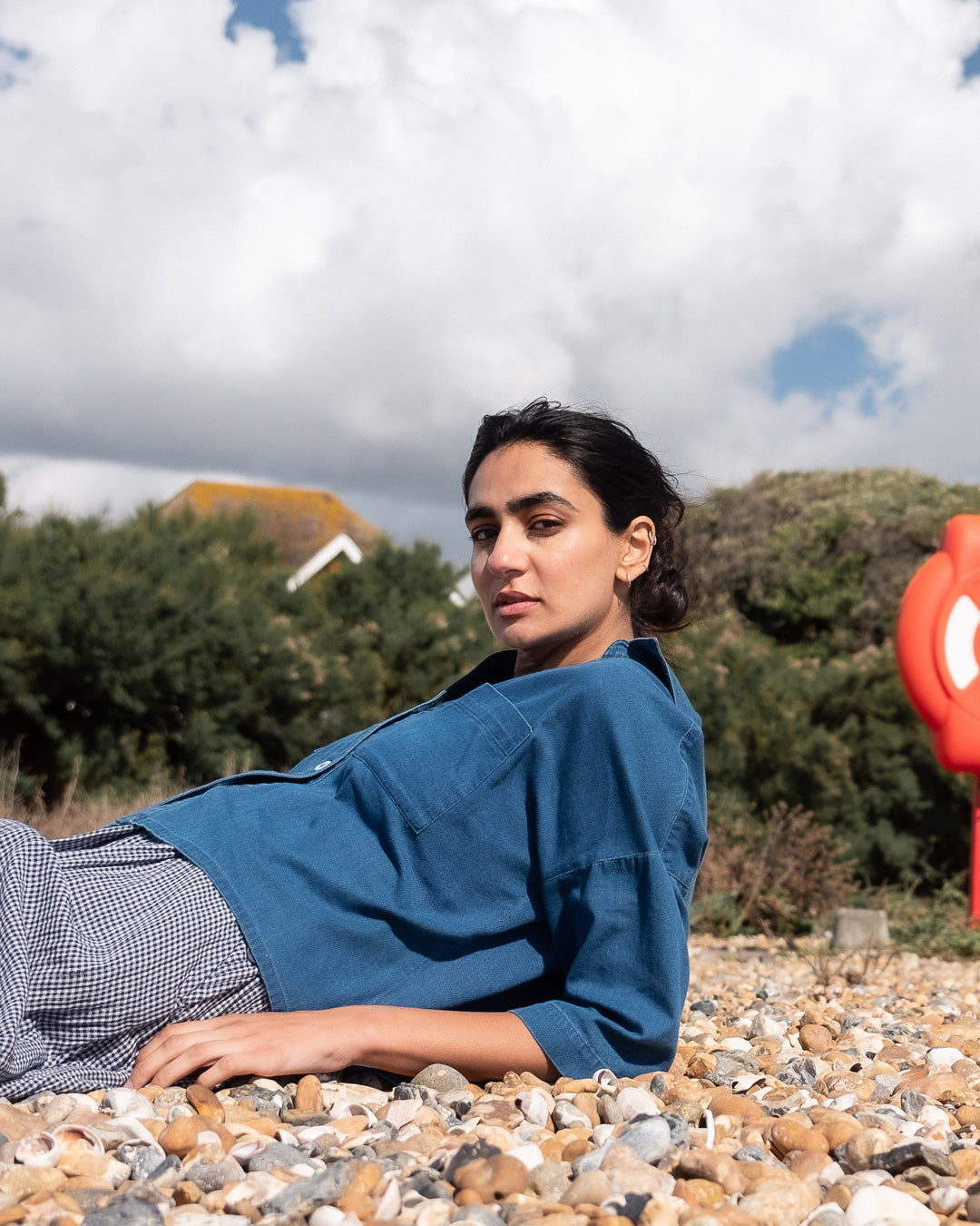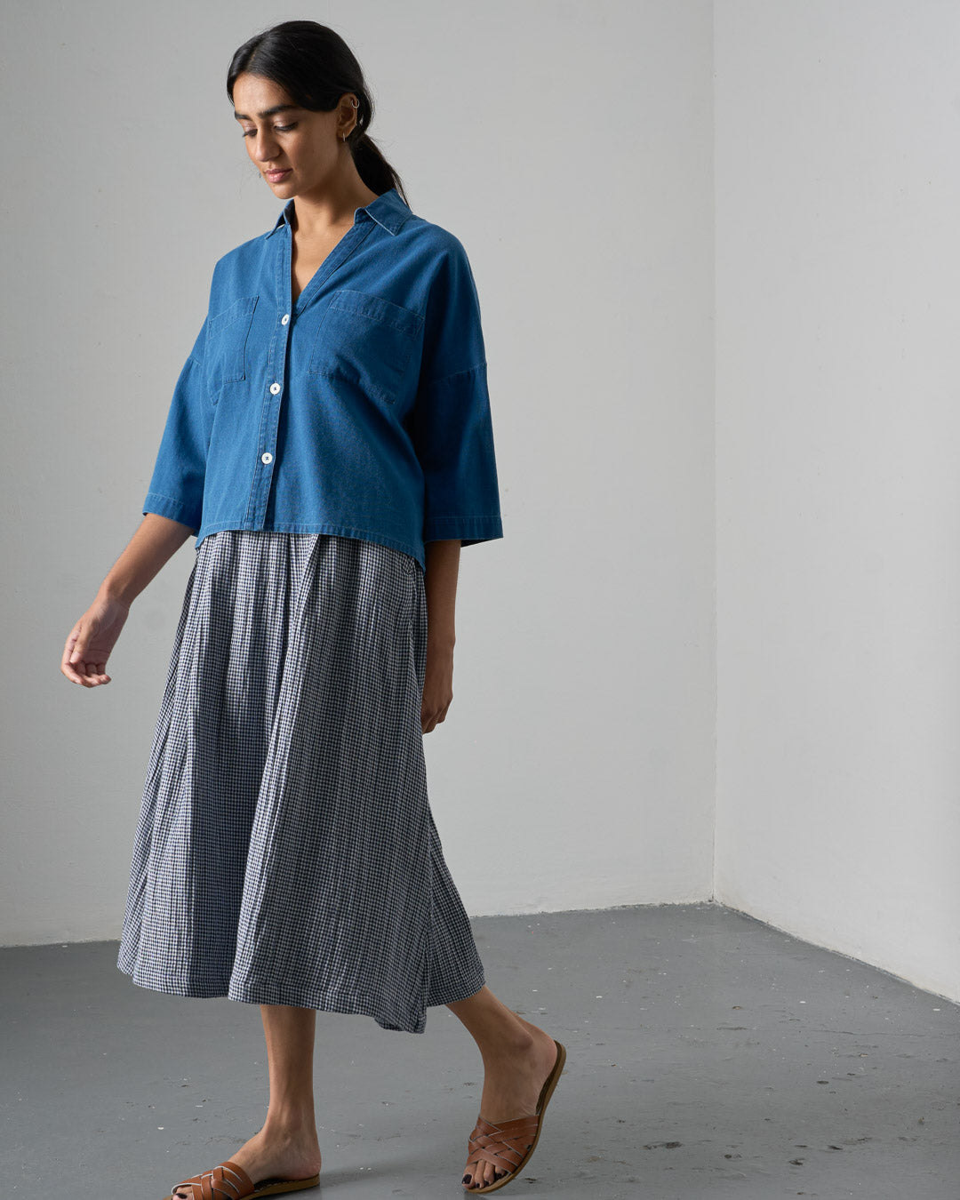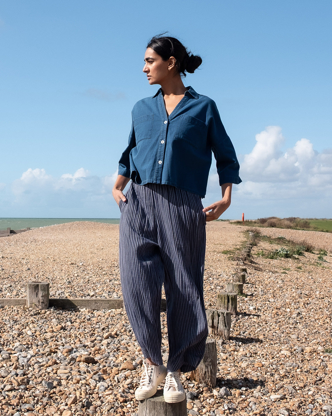 This gorgeous Bibico Ava Shirt in Cotton blouse in a gorgeous textured denim. Soft, supple, and breathable, with a comfortable weight. Cropped, oversized shape with a shirt collar and V-neck opening, dropped shoulders, and bracelet-length sleeves. Back yoke detail and hanging loop, and two patch pockets. A familiar BIBICO piece to wear year after year.
