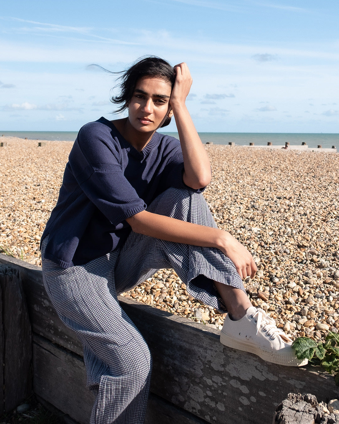 The Bibico Lorren Trousers in Navy Check barrel-leg trousers made in a soft double gauze little check cotton cloth in navy and ecru. Light, breathable, and gently textured, with a relaxed feel that suits warmer months. Designed with a regular front waistband and zip fly, elasticated at the back for comfort. Sits just below the natural waist, with ankle-skimming legs and subtle seam detailing at the front and back. Deep front pockets complete the shape.