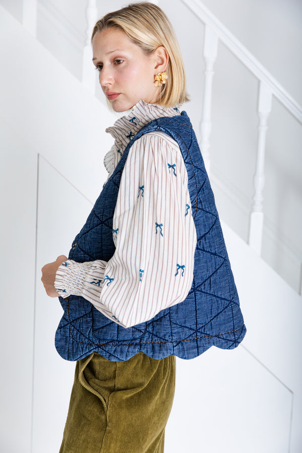 A beautiful + individual, quilted Gilet in a garment washed organic cotton denim + lined in a contrast organic cotton and features a unique scallop edge detail + hand sewn press-stud fastenings + a contrast tan running stitch
