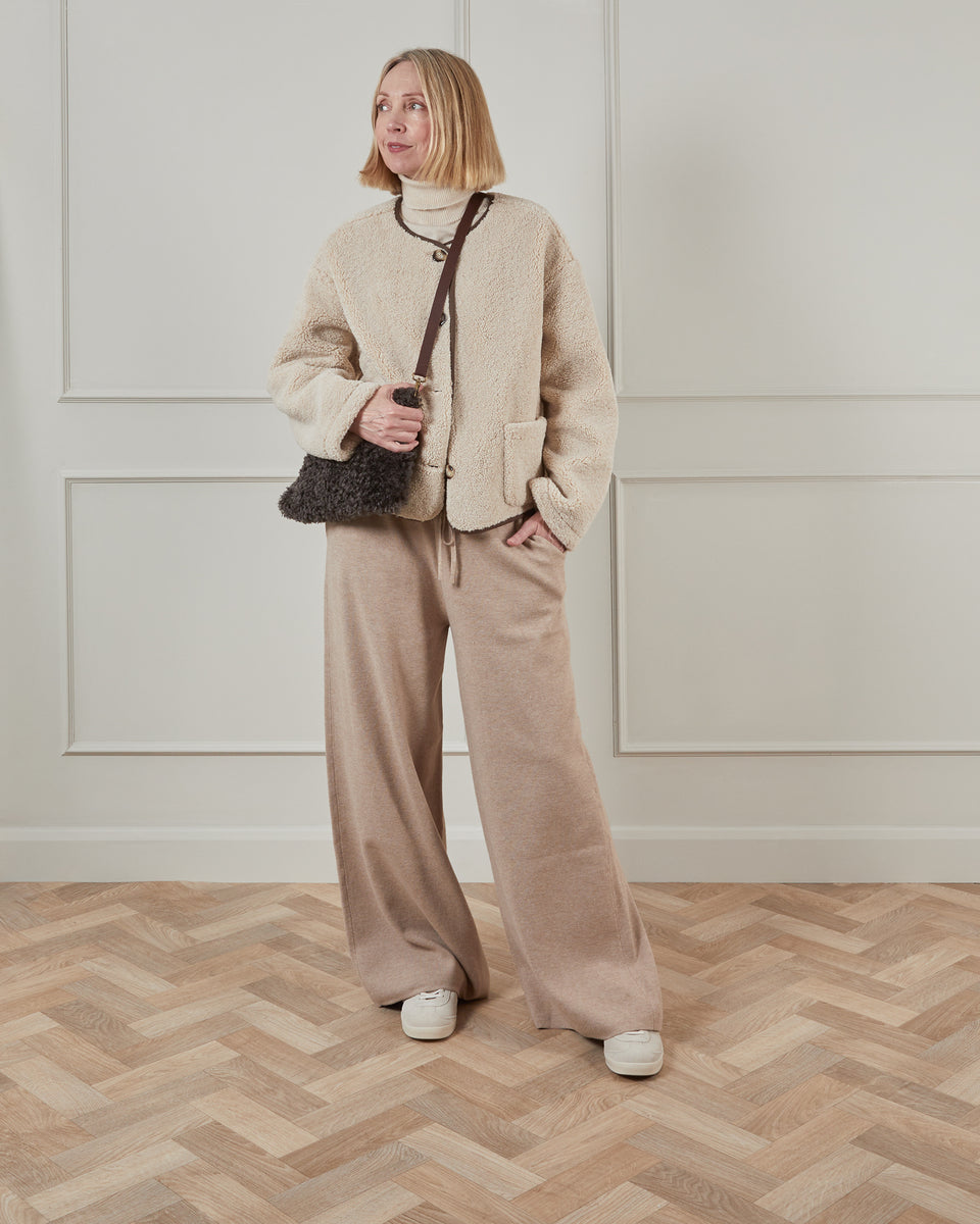 The Chalk Large Pouch Bag features a curly faux fur and pleather lining. It even has a convenient leather strap for easy carrying as well as an attachable long strap for cross body use.