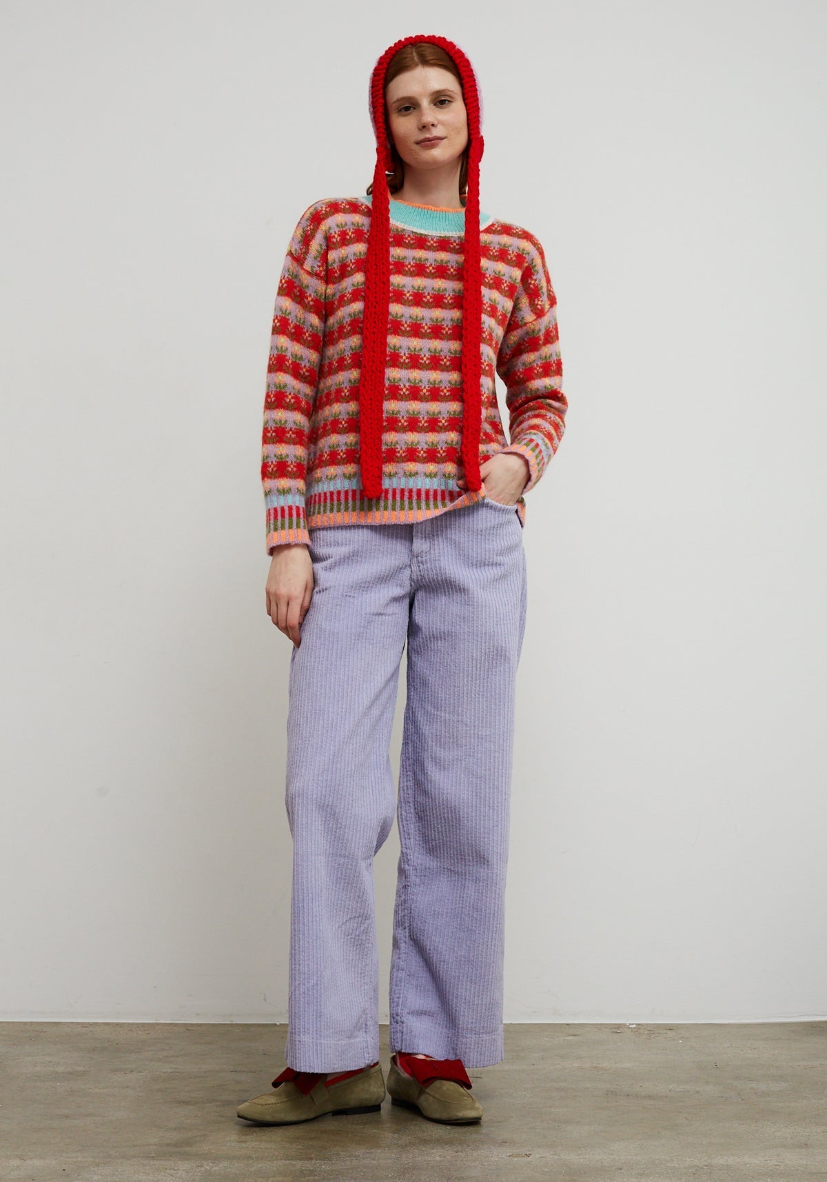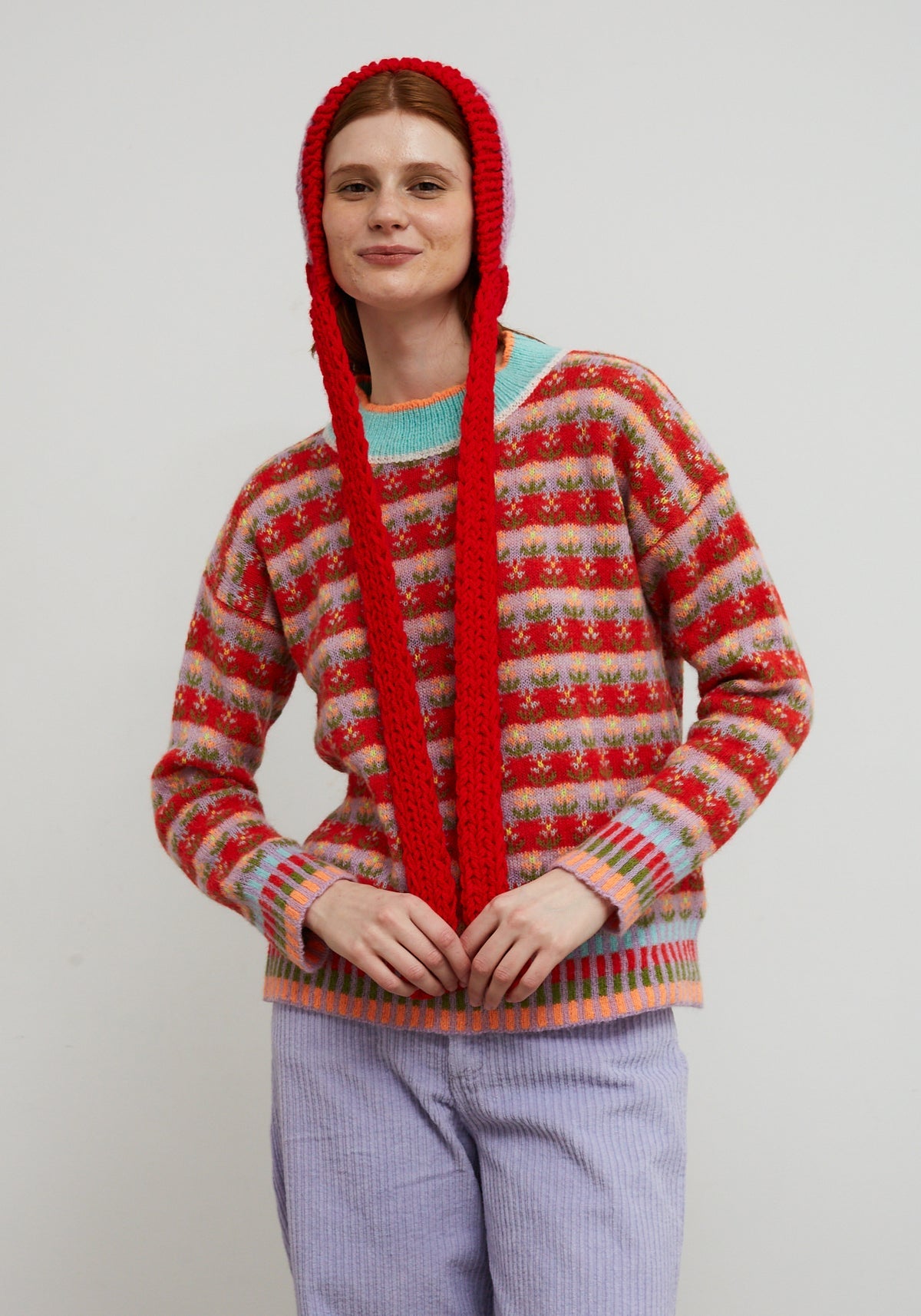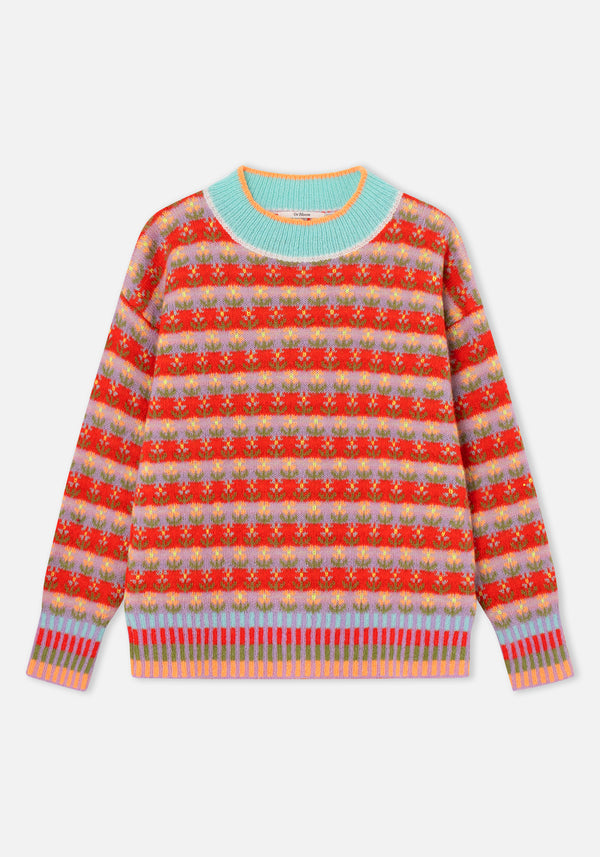Knit sweater with floral print in horizontal stripes in shades of red, lilac, and orange. Wide ribbed round neck with blue contrast and orange finish. Multicolour ribbed cuffs and hem with vertical stripes in blue, red, green, and orange. Straight and comfortable cut.