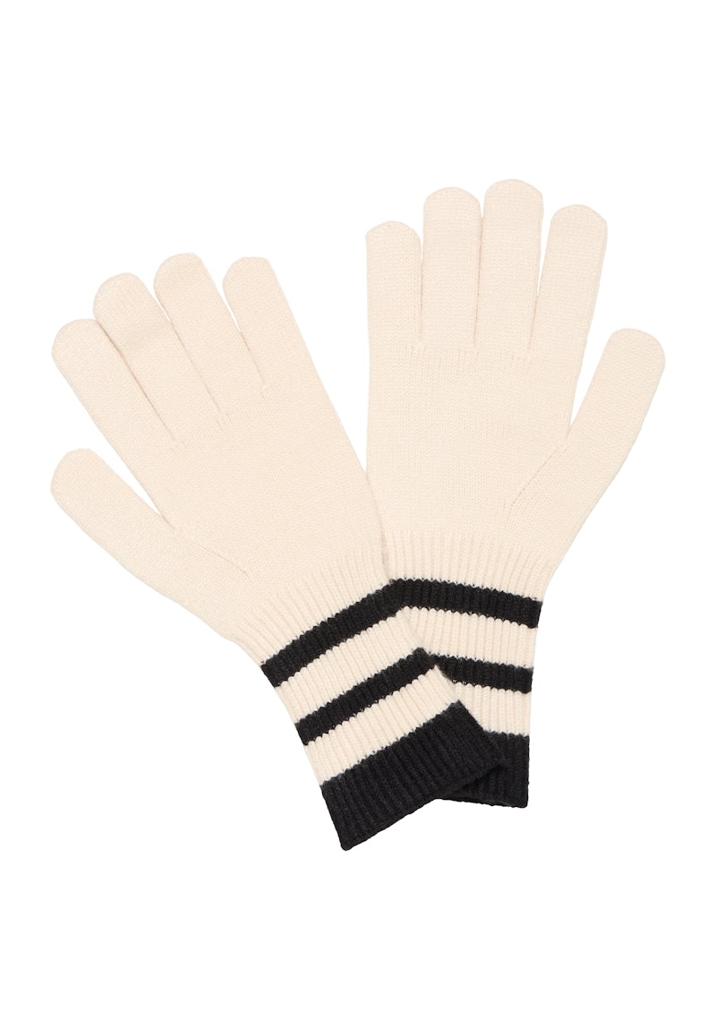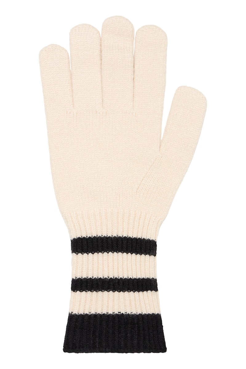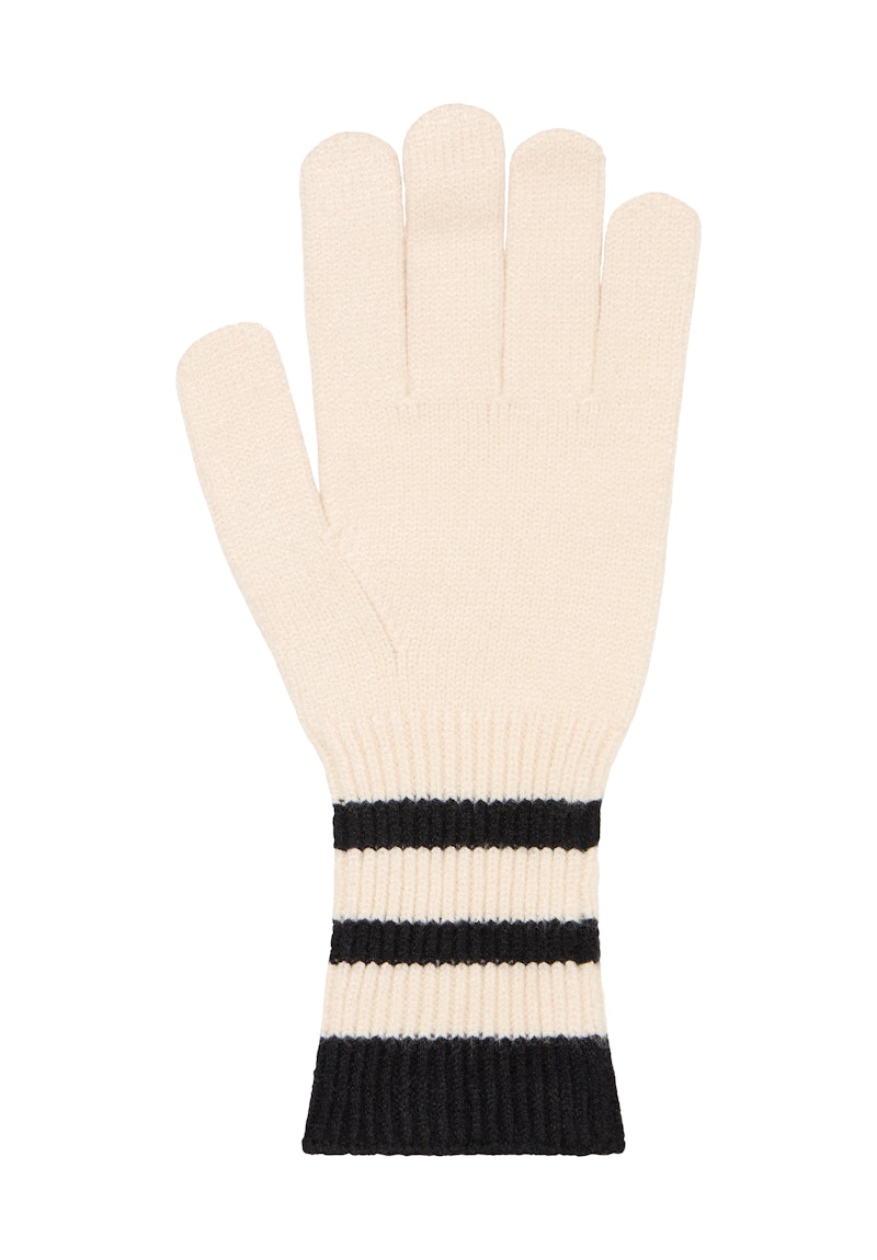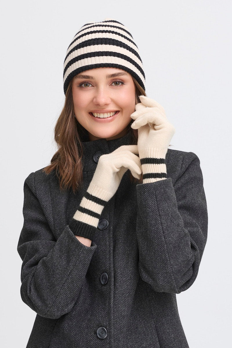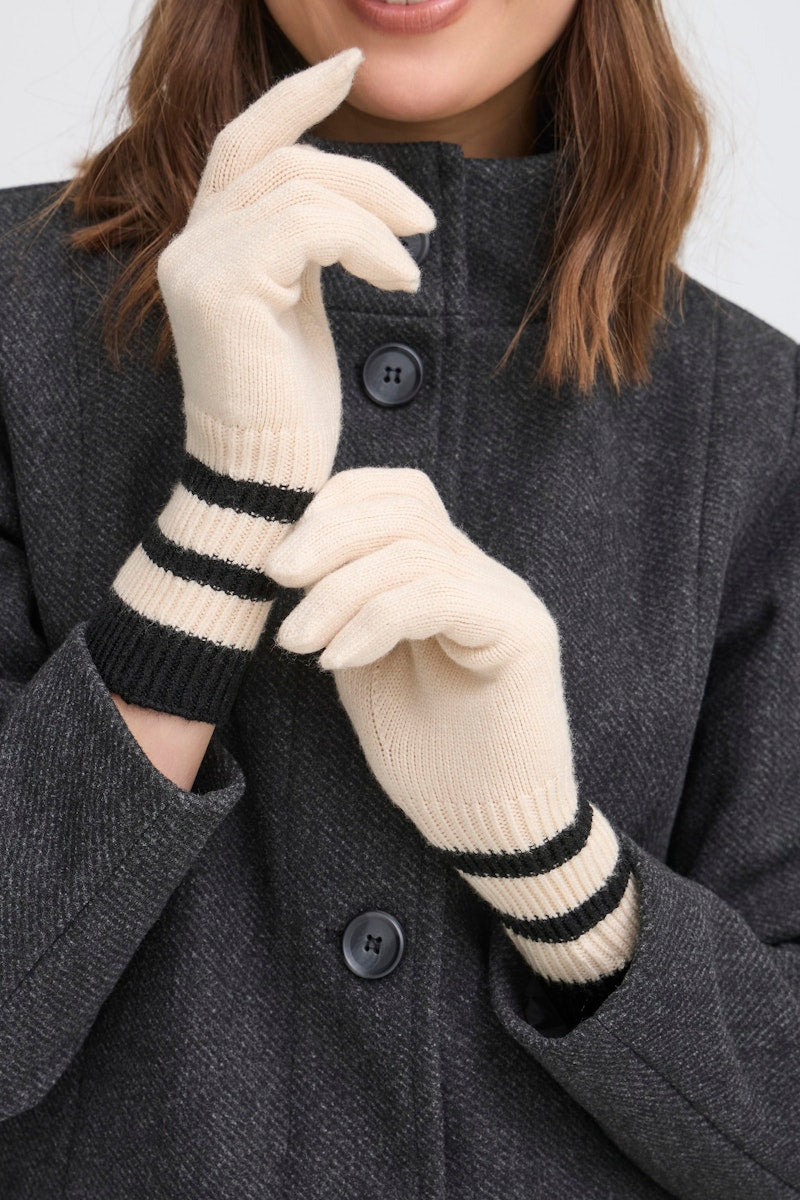 Fransa Stripy knitted Gloves in Whisper White Mix feature a classic fitted silhouette with ribbed cuffs accented by distinct horizontal stripes. Soft texture with full finger coverage.