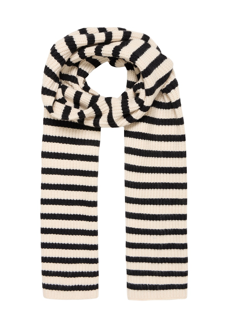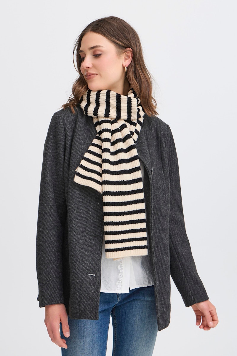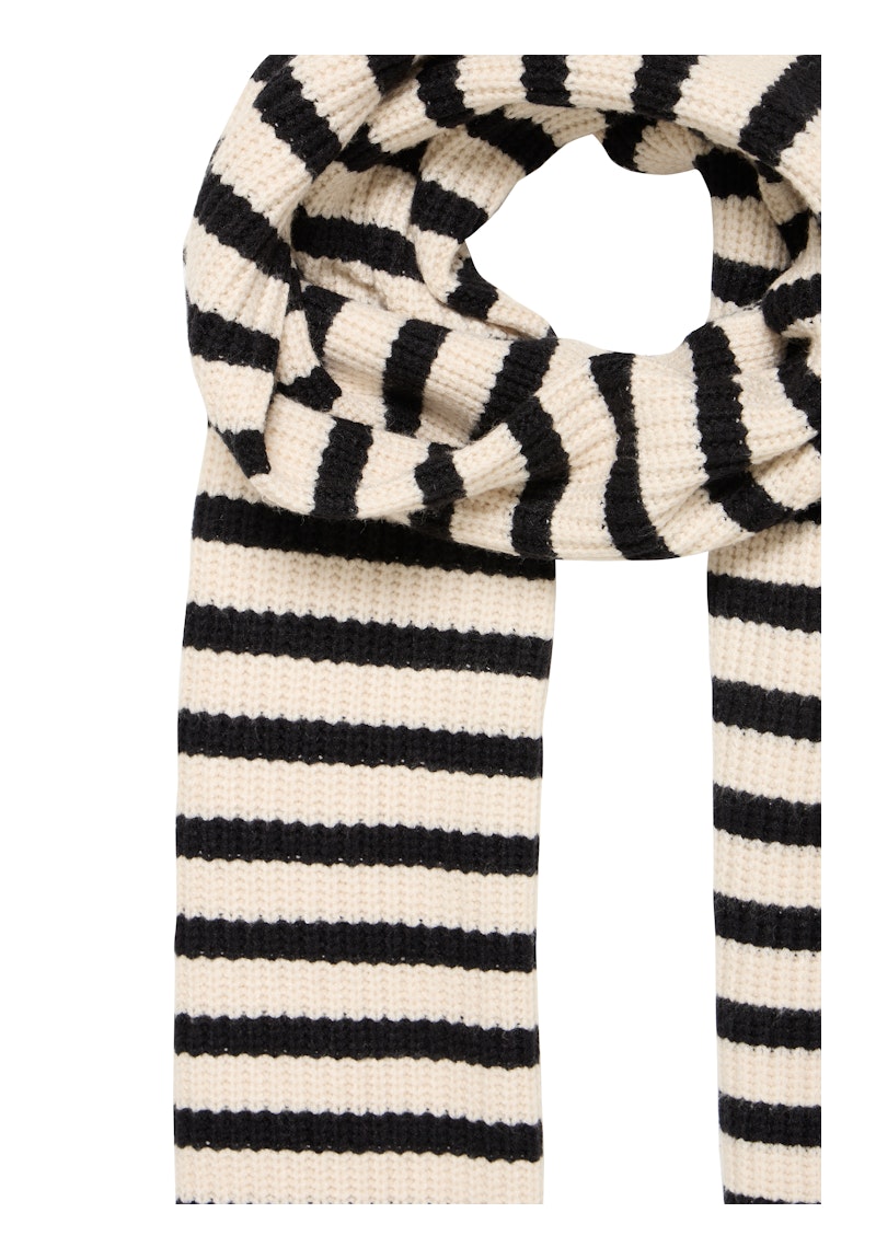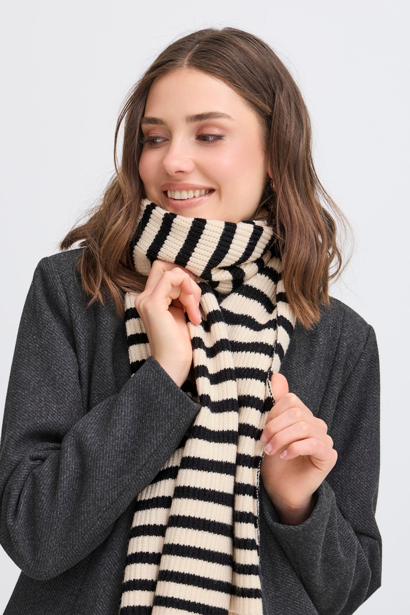 Fransa Stripy Scarf in Whisper White Mix in a wide, chunky knit with bold horizontal lines. The scarf is long and rectangular with a soft, textured finish, adding depth and effortless edge to any look.