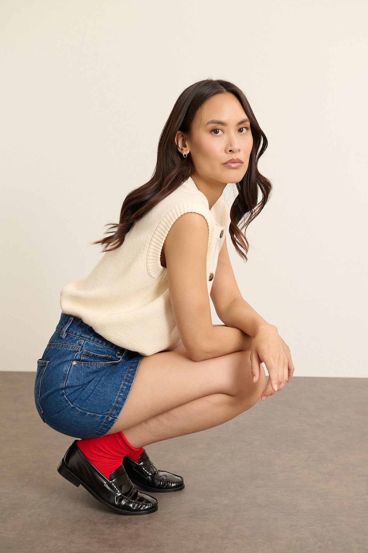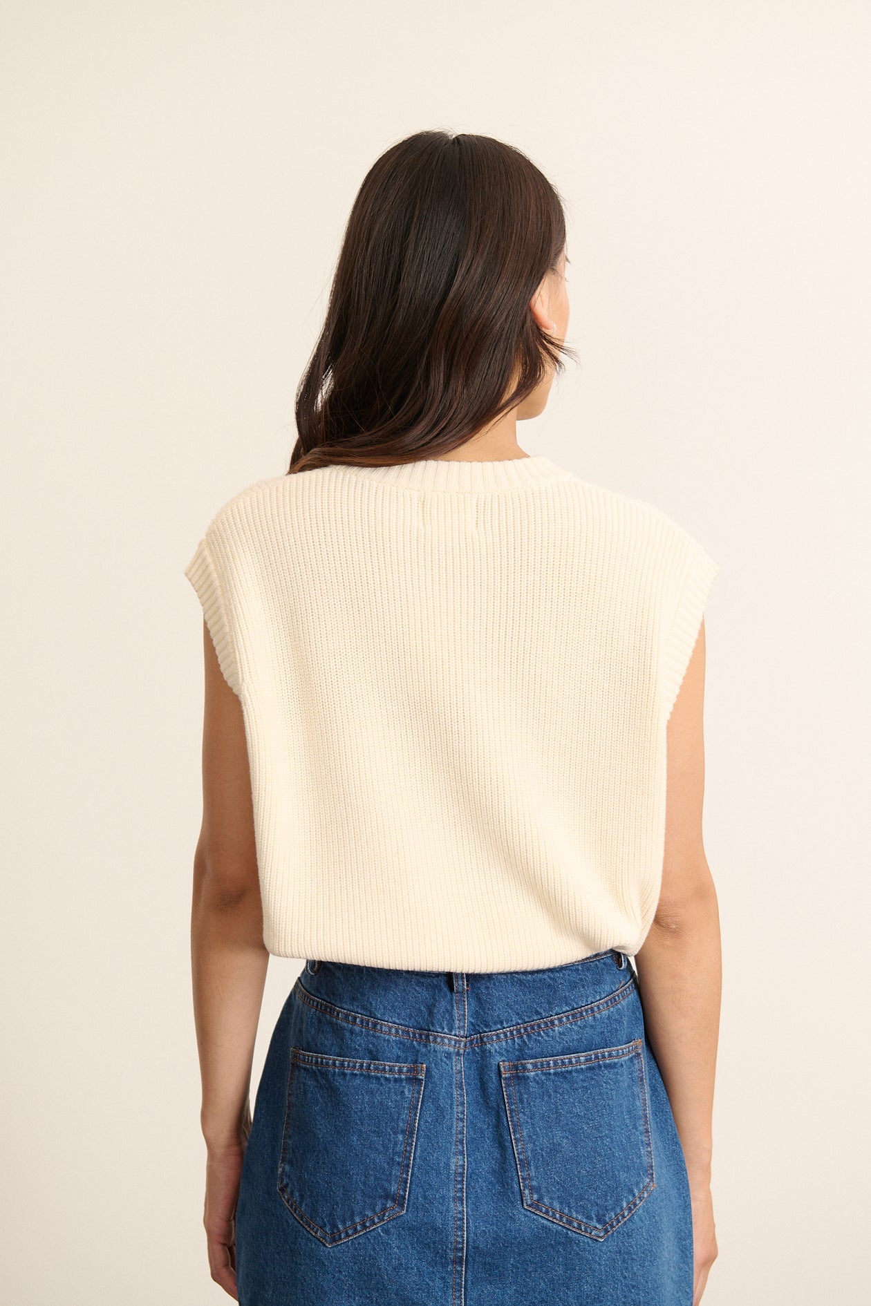 Garance Paris Bisou knit in Ecru, a sleeveless vest in ecru, embodies elegant sobriety. Its mother-of-pearl effect buttons bring a refined touch to this versatile piece, easy to wear every day. Made of a soft and light material, it offers a pleasant warmth while enhancing the silhouette with naturalness.