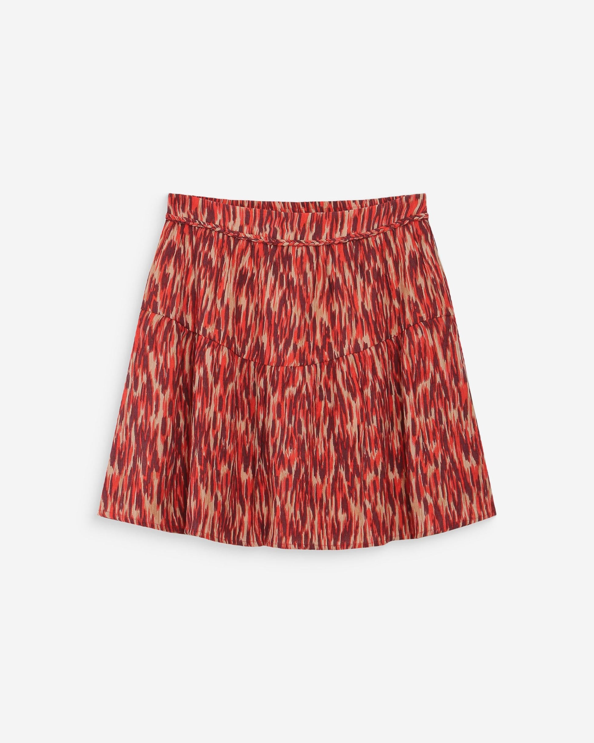 The Grace & Mila VALSE short skirt reinvents a bohemian spirit with its warm-toned graphic print for a look that is both retro and feminine. The trapeze cut and flowing fabric add movement and lightness to the silhouette. The VALSE printed skirt features a mid-rise elastic waist and a braided detail at the waistband, making it a polished piece with thoughtful details.