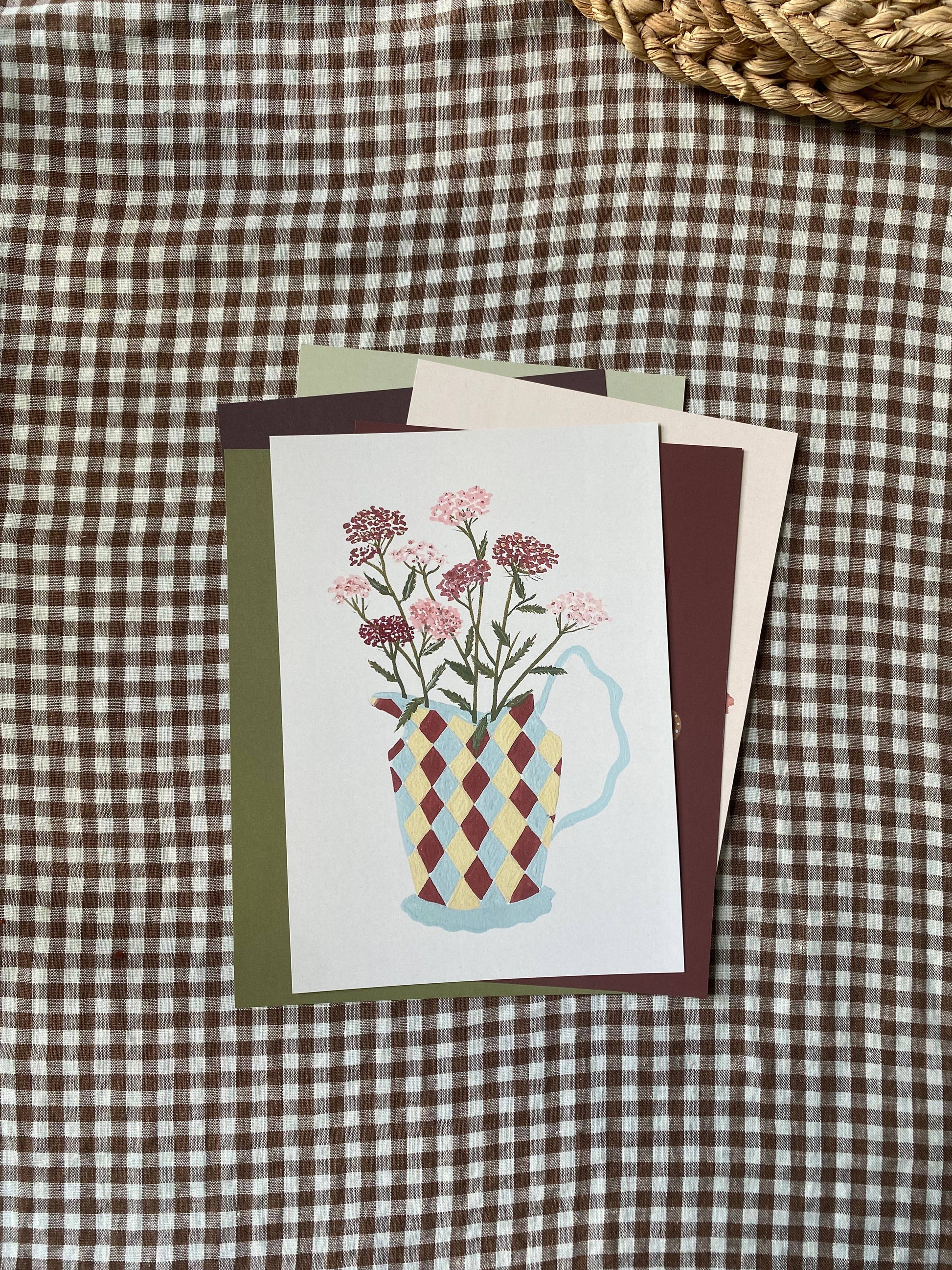 Hand painted in Gouache, and printed in England on textured part recycled paper at 300gsm. These cheerful prints are inspired by the spring and summer blooming flowers. Backed and protected by a cellophane sleeve.