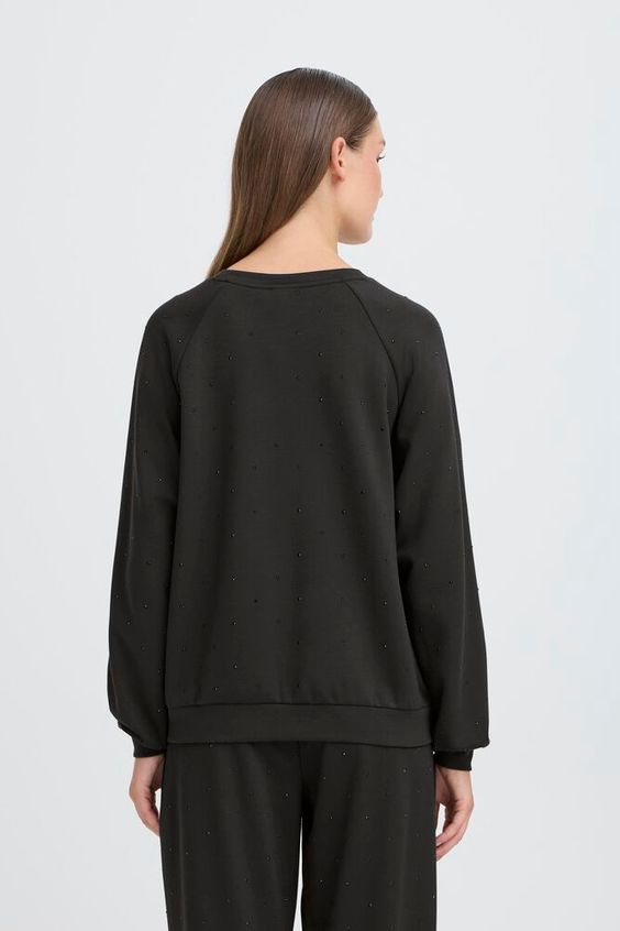 The ICHI Amias LS Sweat in Black, with a twist. Adorned with little shiny dots that elevate this cute, casual, loose fit sweater.