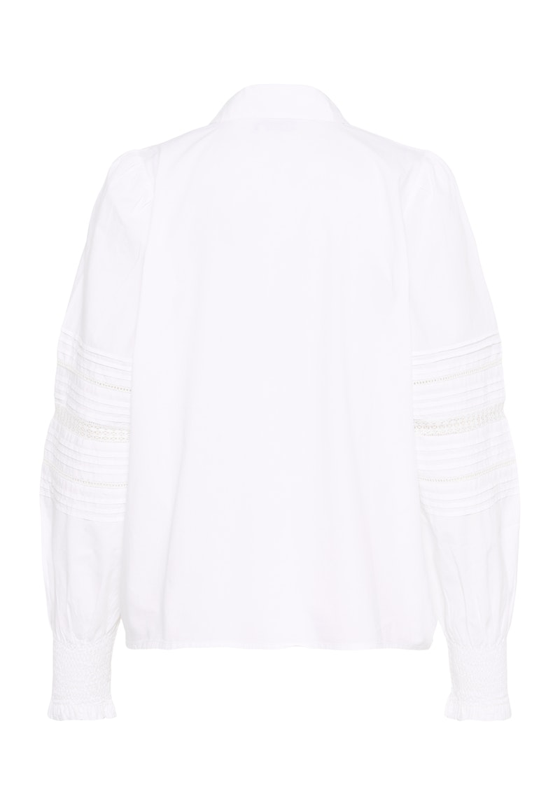 The KAFFE Bella Shirt in Optical White with a straight fit, crisp texture, and classic collar. Features vertical pintuck detailing and openwork inserts on body and sleeves. Button front closure and long sleeves with elasticated cuffs.
