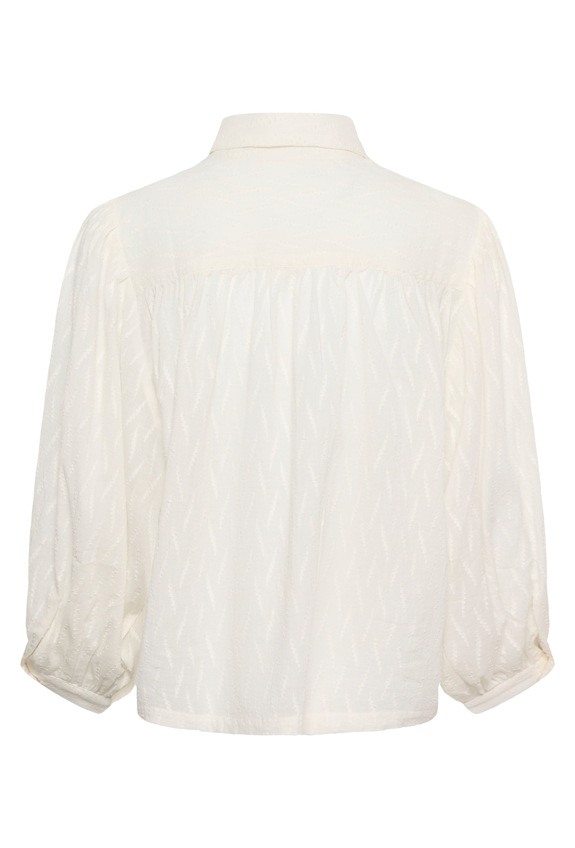 The KAFFE Gabriela Shirt in Chalk in a beautiful textured fabric, features a boxy fit with a classic shirt collar and dropped shoulders. An airy look with 3/4 balloon sleeves, cuffed and buttoned. Effortless style made easy.