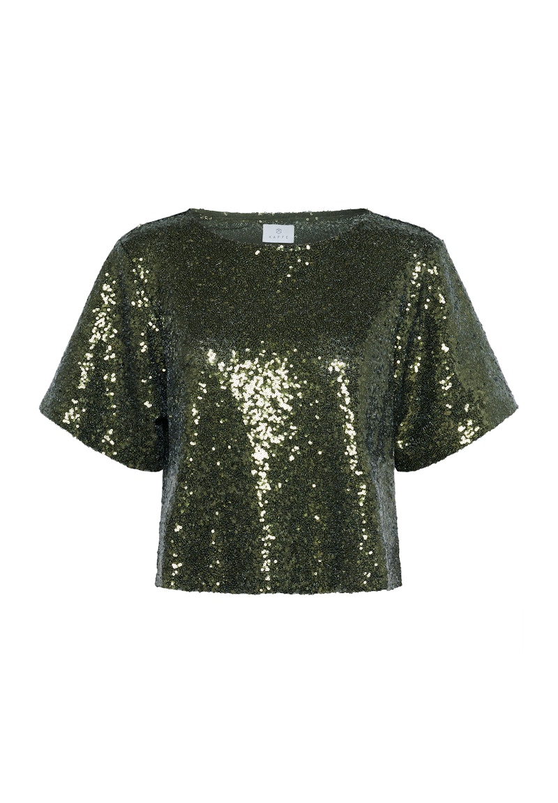 The Kaffe Miranda Blouse in Ivy Green, a sequin top with boxy silhouette and short sleeves. Features a crew neckline and cropped length, fully covered in shimmering sequins for an eye-catching effect.