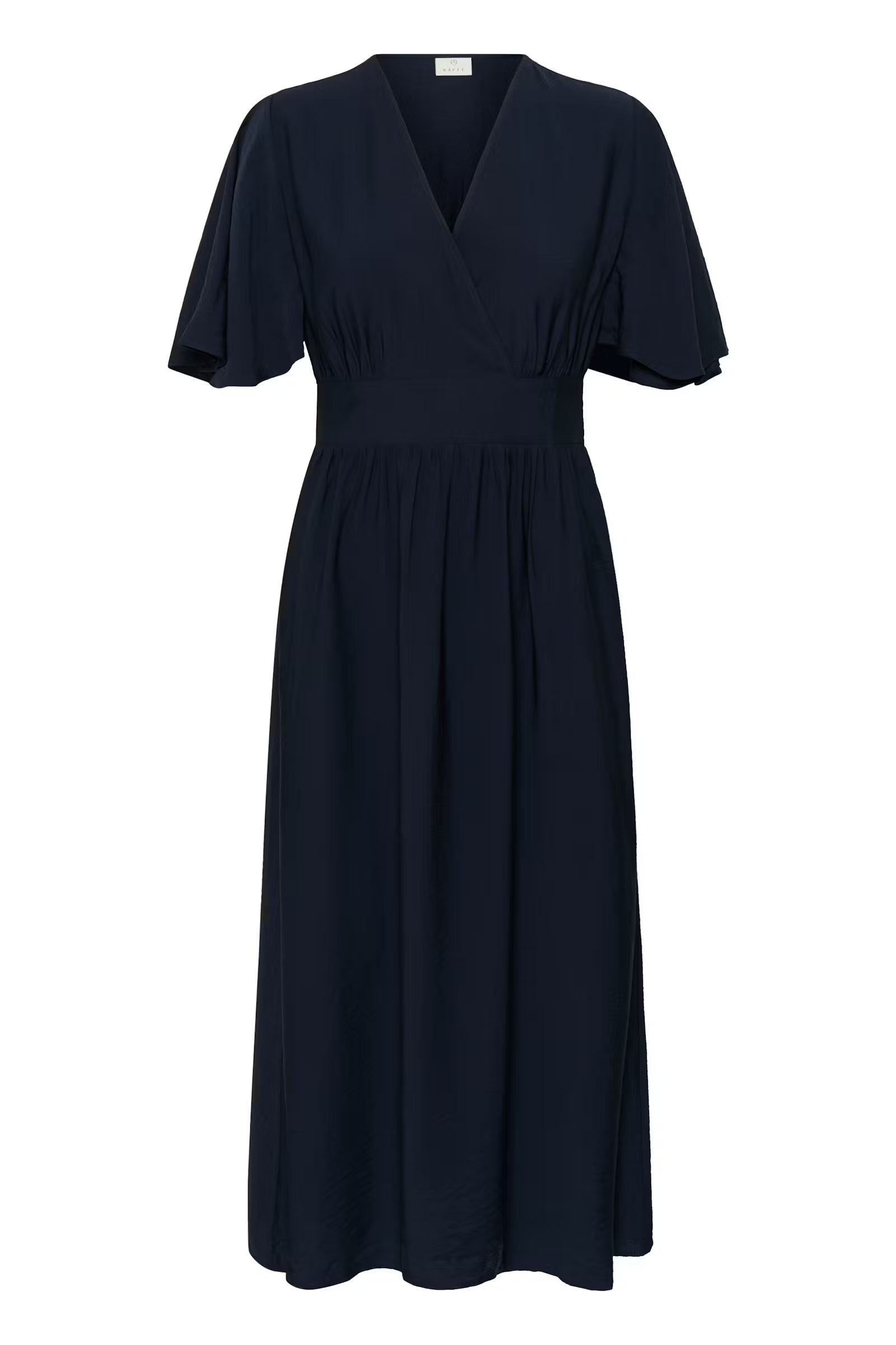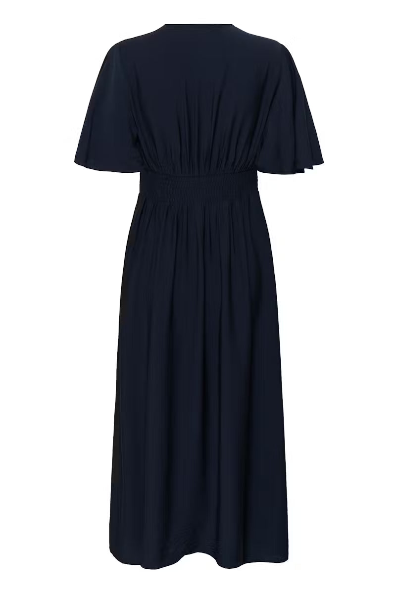 Kaffe Sirena Long Dress in Midnight Marine with a defined waist, V-neckline and relaxed short flutter sleeves. Flowing silhouette with gathering at the bust and skirt for added movement.
