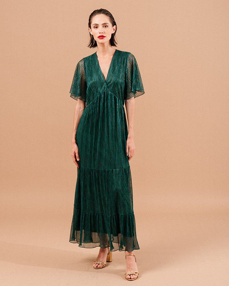 This is a stunning maxi dress made from pleated lurex mesh fabric featuring a surplice neckline, short butterfly sleeves, an elasticated waist and a tiered skirt. The dress has an A-line silhouette. Style with heels or high heels boots. This fancy dress can be worn day and night depending on the mood.