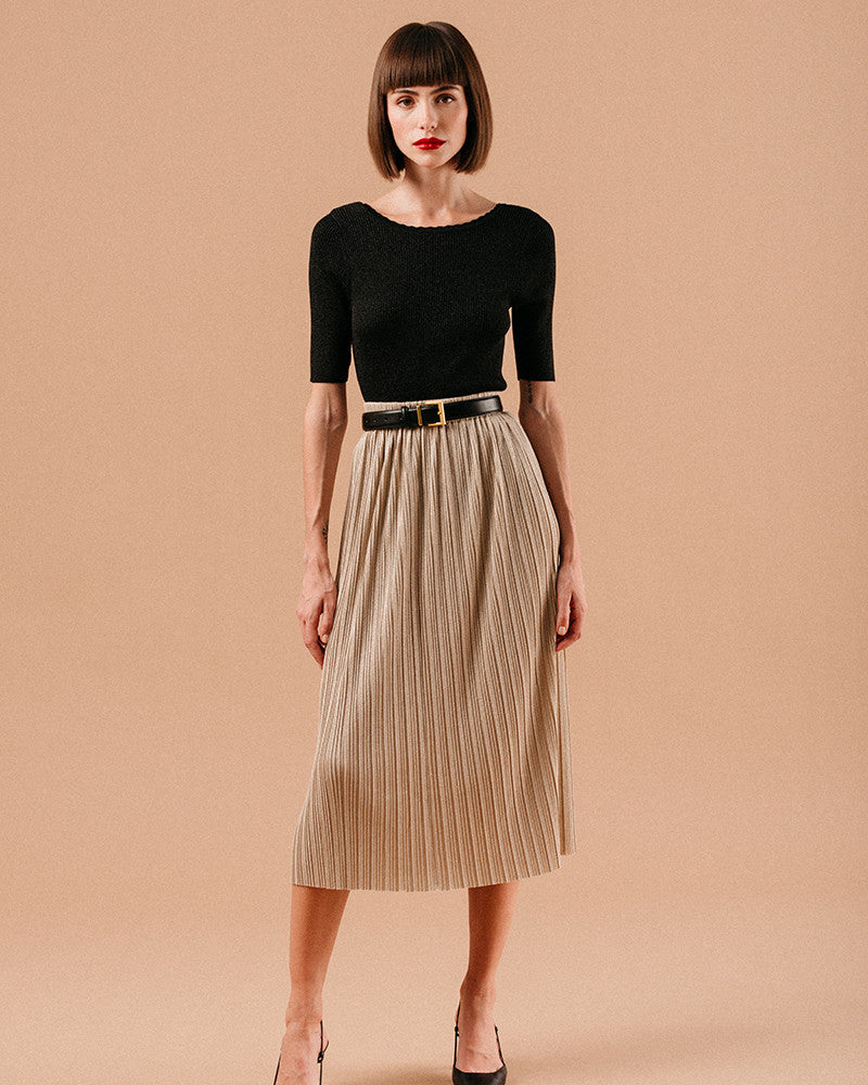 The LUZ dress is a must-have in our wardrobe, with its flowing and easy-to-wear silhouette. The airy LUZ skirt is particularly captivating as it follows your every move, making it perfect for a range of occasions. For a feminine and flowing look, the LUZ midi skirt can be paired with the LYRIQUE bodysuit and LAURENTIN belt. To complete the outfit, we like to add boots and a long coat for a trendy city look.