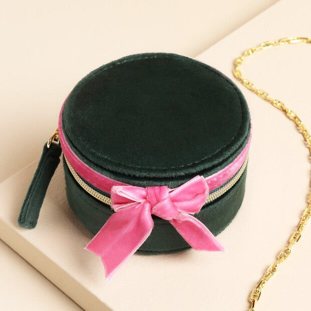 Lisa Angel Green and Pink Velvet Bow Mini Round Jewellery Case