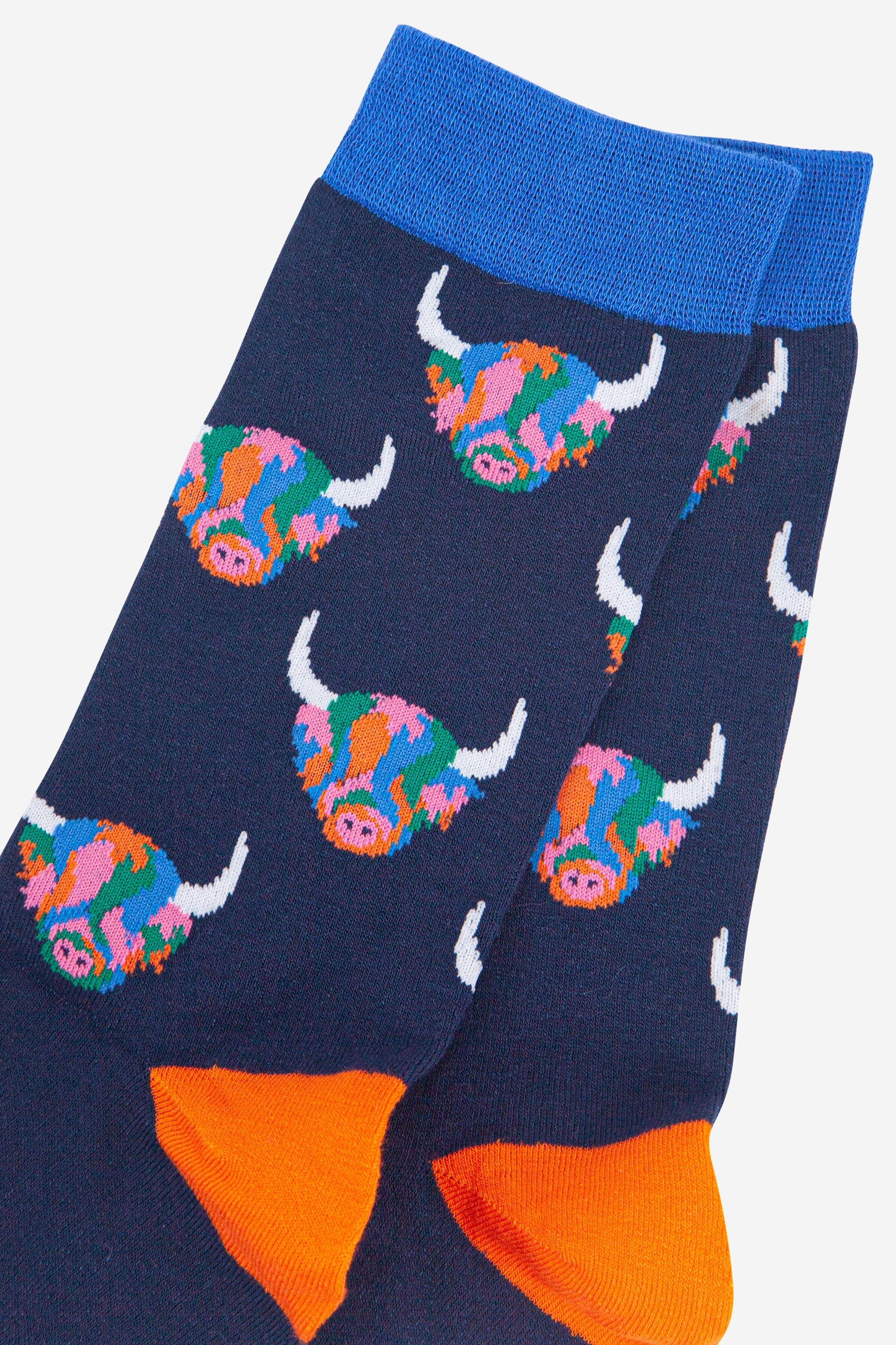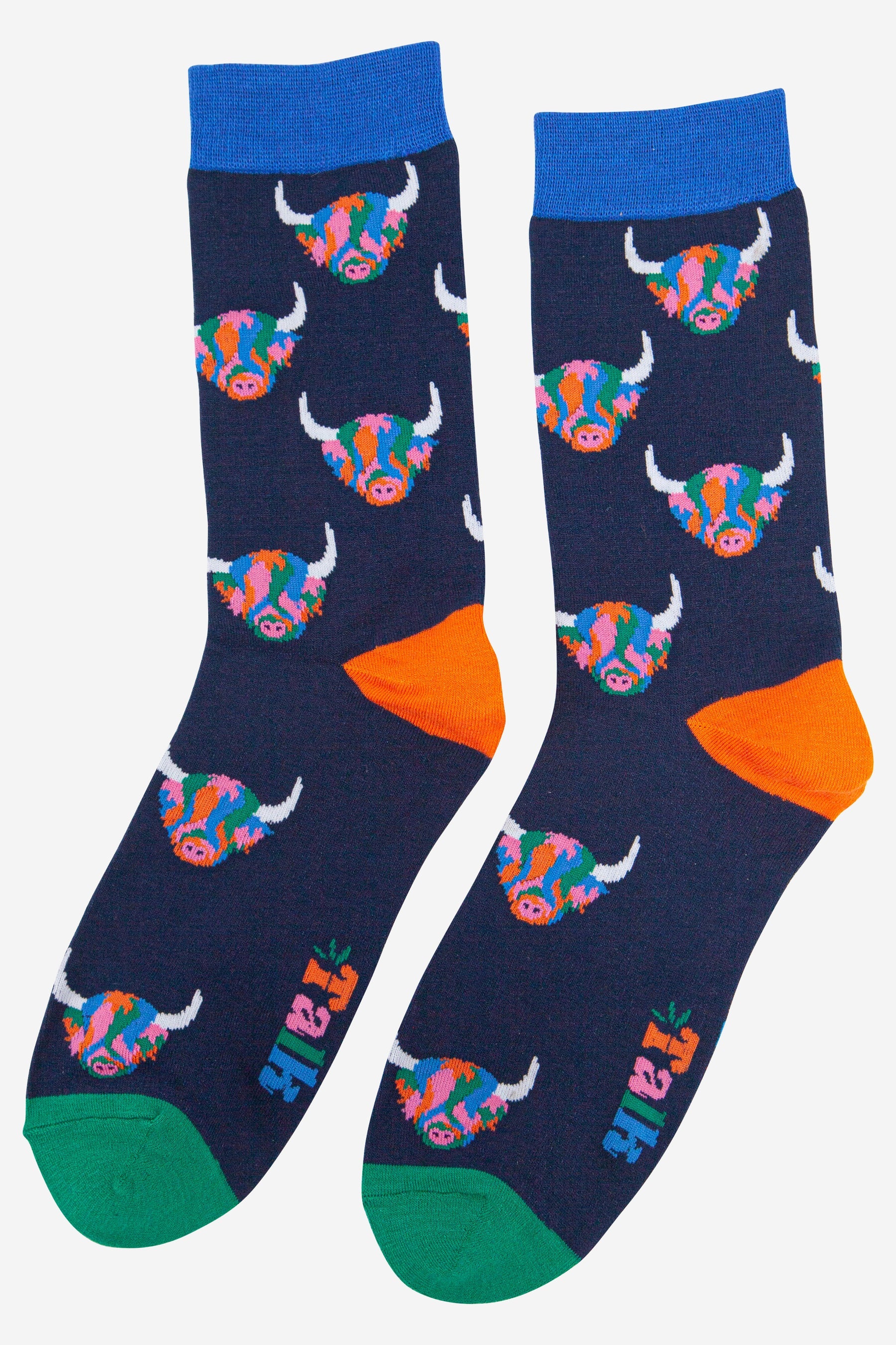 Men's Bamboo Socks - Navy Blue/Rainbow, Highland Cow