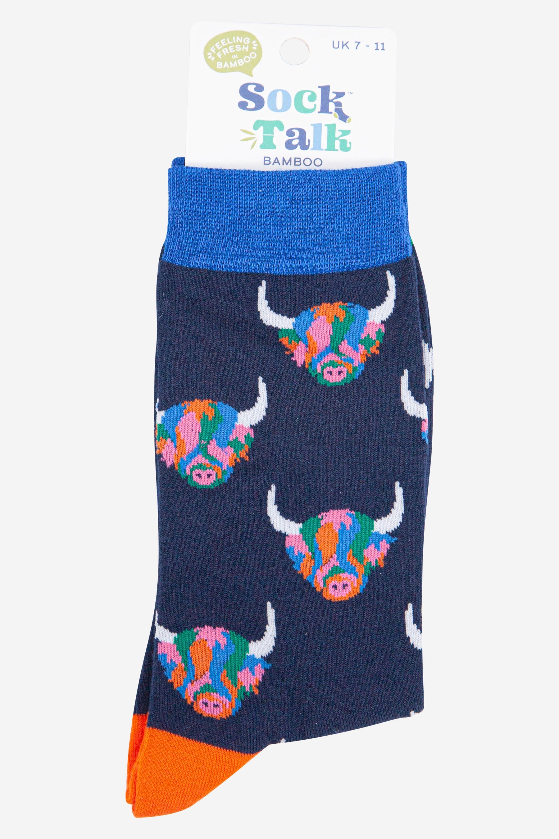 Designed in the UK, these Scottish highland cow socks are crafted from sustainable eco-friendly bamboo. Showcasing multicoloured highland cows, these bold navy blue socks are naturally breathable and feel luxuriously soft.