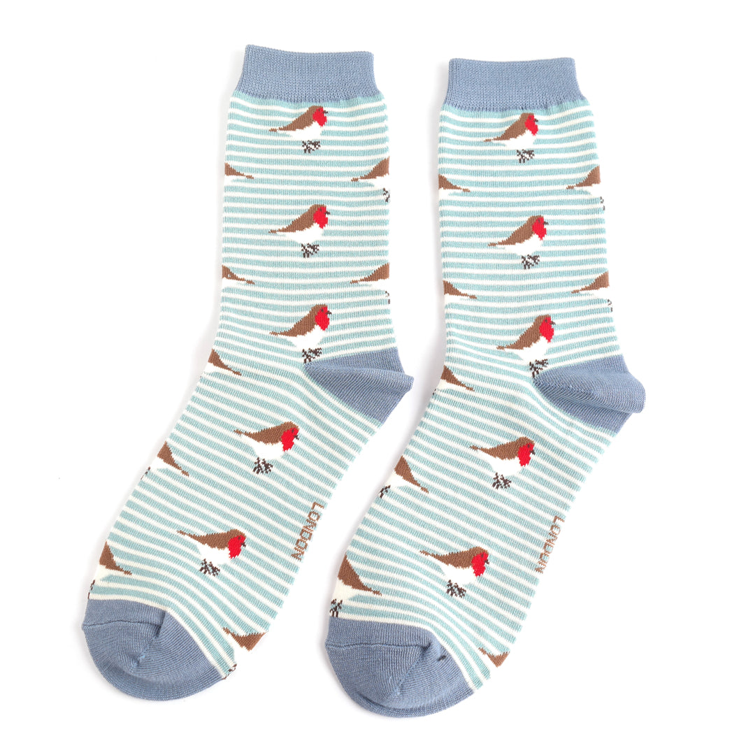 Miss Sparrow Robins on Stripes Socks Duck Egg