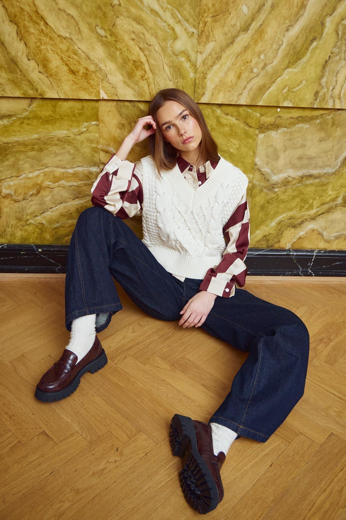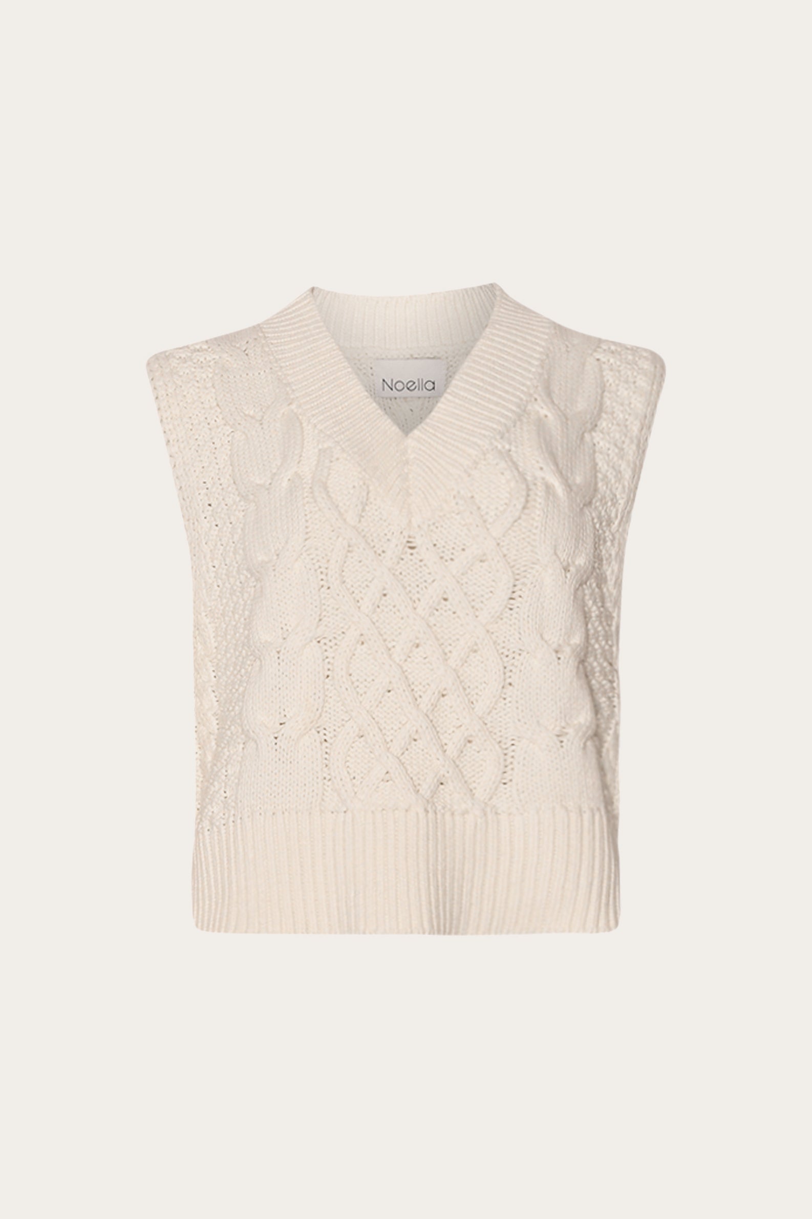 Noella Gio Knit Vest Ivory, a cute cropped knit vest with cable design and the perfect layering piece for Autumn