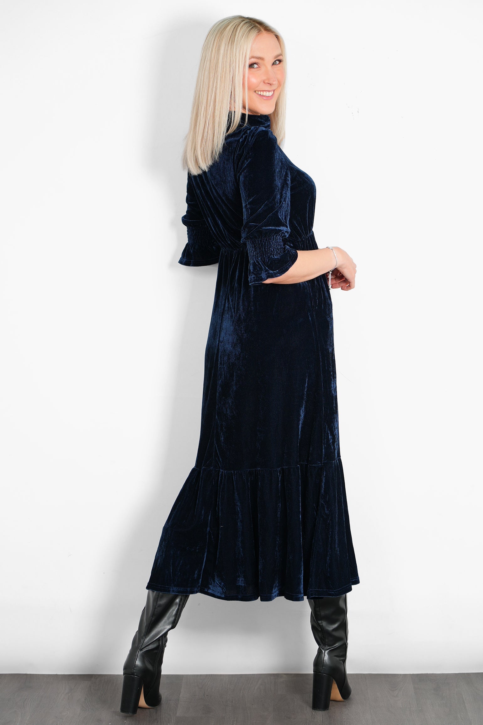 The Pandora V-Neck Midaxi Dress in Navy Blue, a classic midaxi dress crafted from soft velvet fabric. Showcasing an open V-neck collar, tiered hem and fluted cropped sleeves. This dress is the perfect occasion piece designed to create a flattering silhouette.