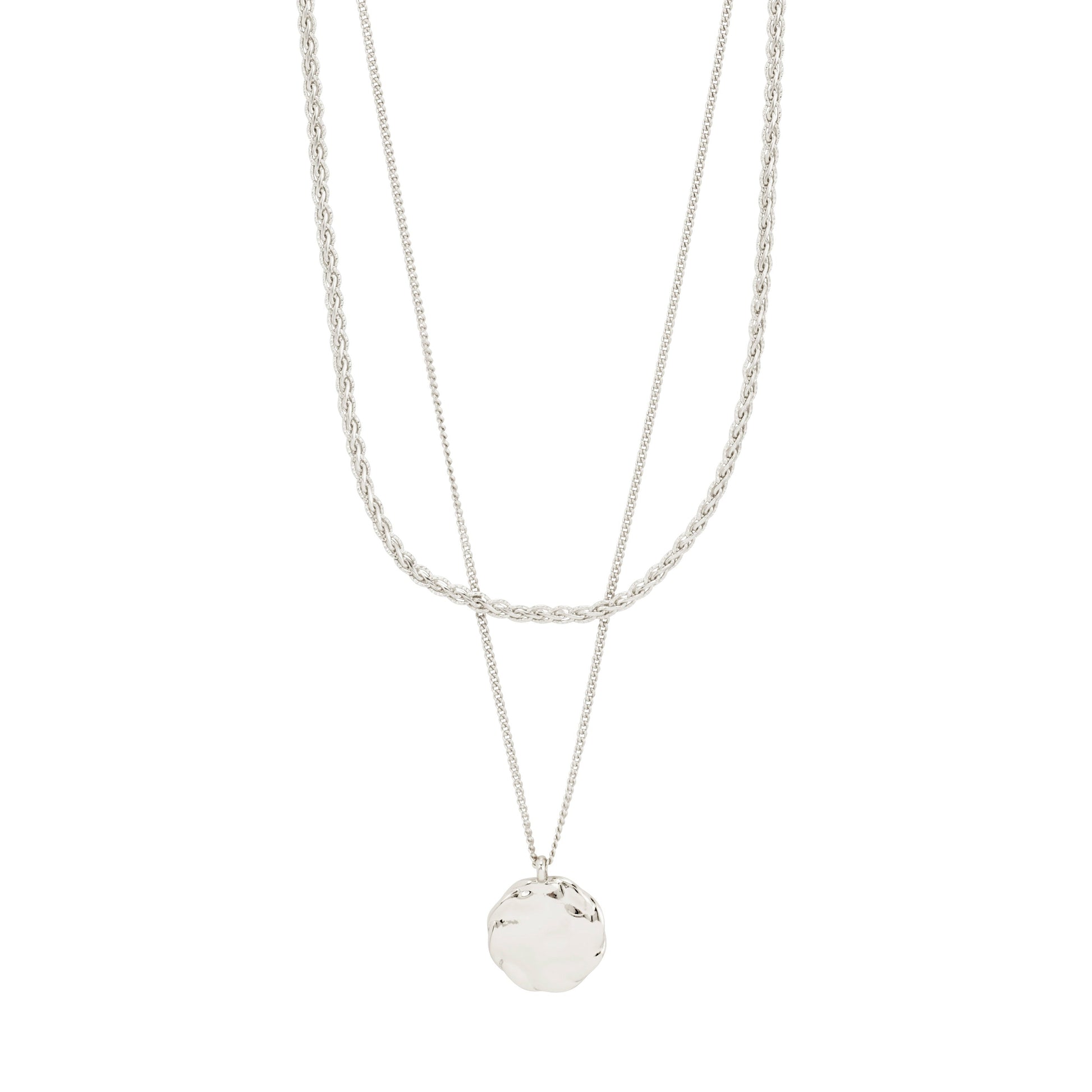 The Pilgrim DECLAN necklace 2-in-1 set, Silver-plated, double the style! Silver-plated set featuring two distinct necklaces – one a braided chain and the other a coin chain with a rustic, shiny pendant. Ideal layering pieces for a stacked style that captures seasonal trends, or wear them individually for a minimalist statement that elevates your everyday outfits. Pair with an oversized blazer or white tee to achieve an effortless look with a laid-back charm using the DECLAN chains.