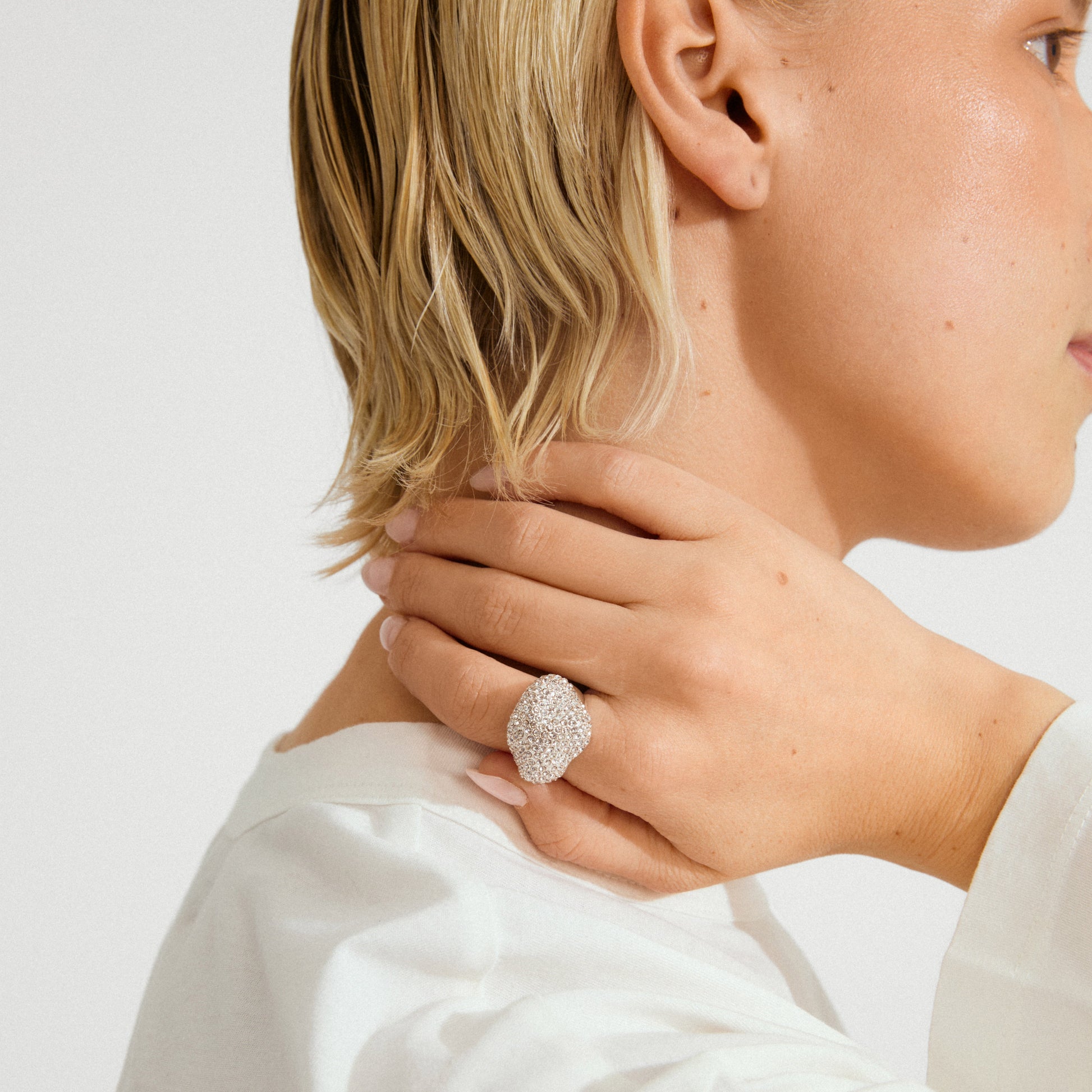 Glow big or go home! The silver-plated LAEL ring from Pilgrim is a true power piece that guarantees you maximum shine and effortless glam. Covered in sparkling Preciosa crystals and shaped in a wavy silhouette inspired by rolling landscapes and soft sand dunes. A dreamy yet striking design that puts the spotlight on your style. Perfect for both grand nights out and everyday luxe moments. Wear it solo for an elegant statement or stack with delicate rings for a cool mix. The ring has an adjustable size for a perfect fit and is crafted from durable, water-resistant materials with 85% recycled content - because every detail matters.