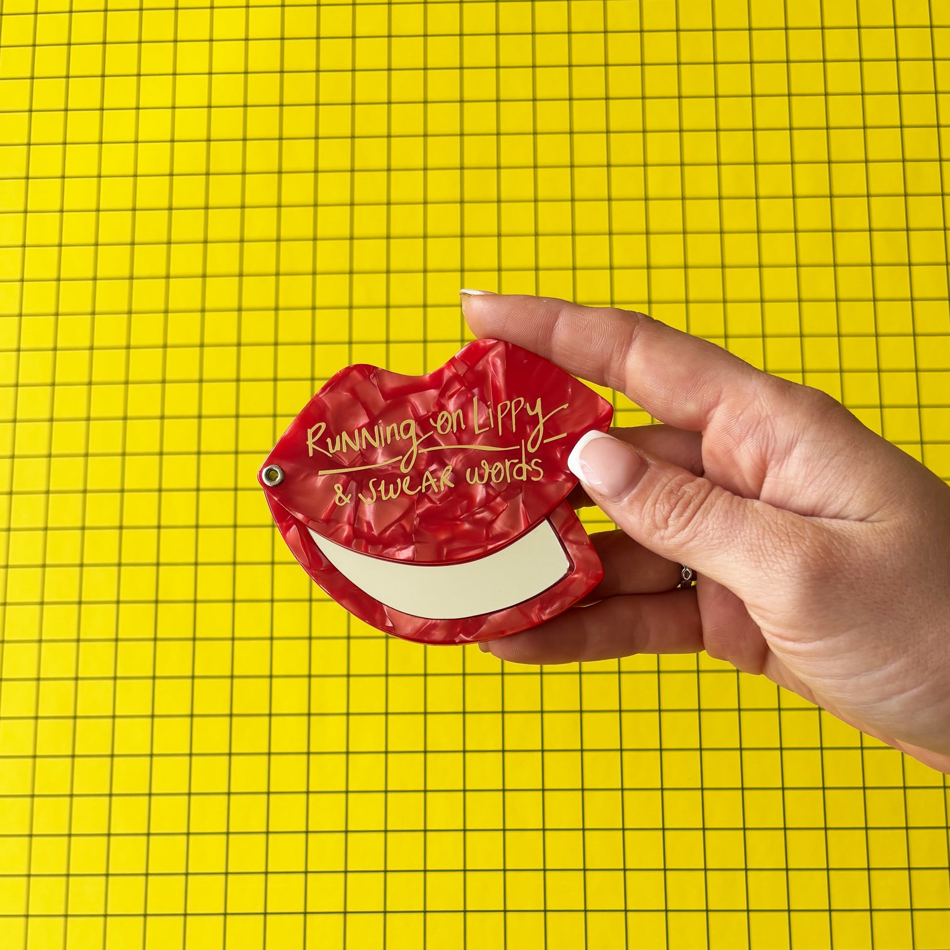 Small Talk Lips Compact Mirror. Having one of those days when you're 'Running on swear words and lippy'?! Pucker up , smile and add a bit of sass to your beauty routine with our super cute acetate compact mirror!