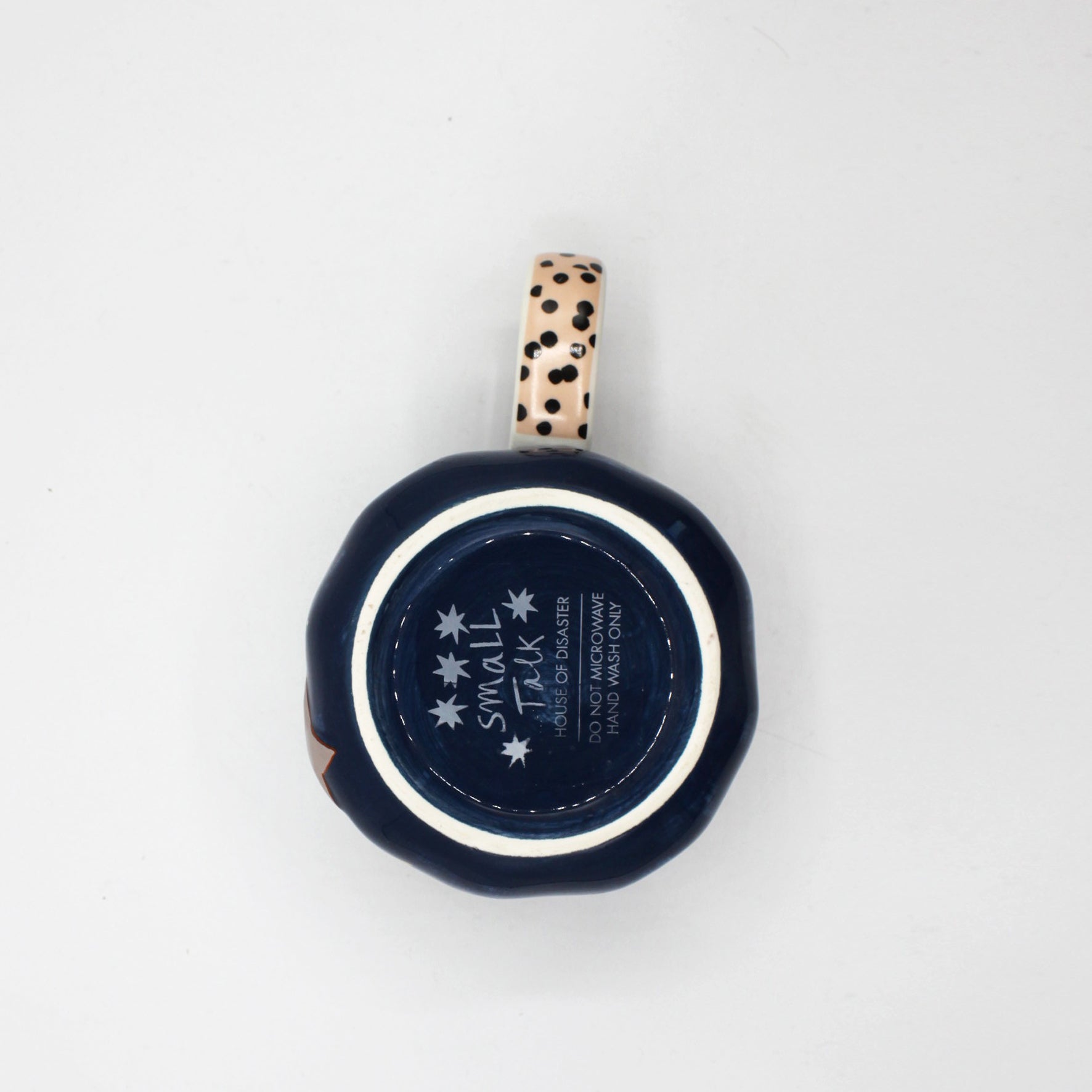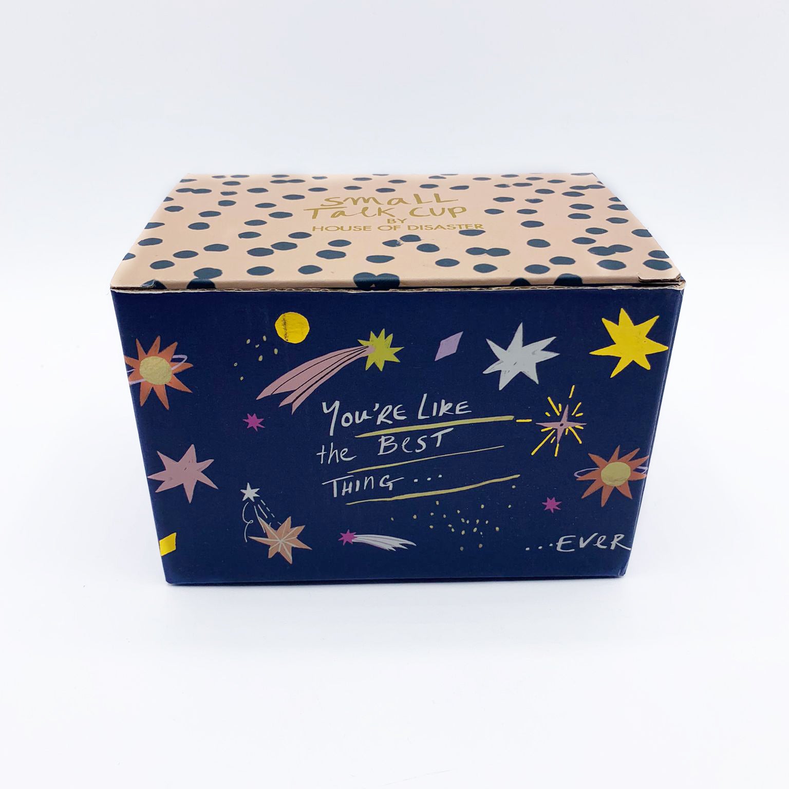 Get your caffeine fix in this quirky little mug! This cutie has a battered handmade feel, and might look a little wonky... but don't worry, it's supposed to! Covered all over in a gorgeous celestial print, with a 3D star on the front, this mug also holds a secret message that starts on the front and finishes on the inside! This little memo reads "You're like the best thing... ever". It would make a lovely gift for a friend with a good sense of humour.