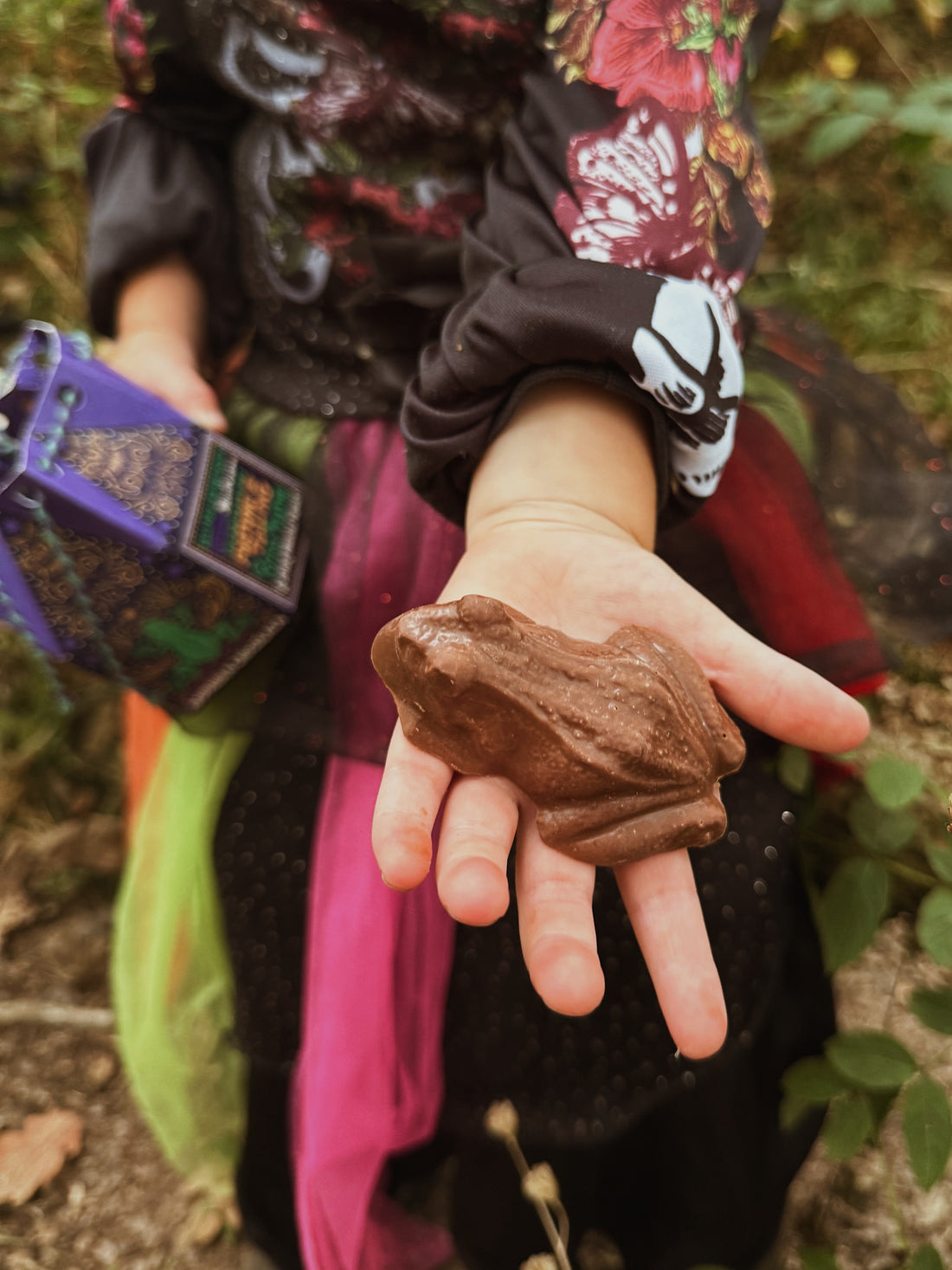 “Witches’ choice”. Two whimsical solid milk chocolate frogs, said to bring great power to those who catch them.