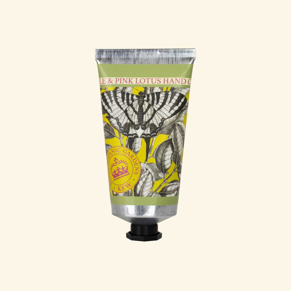 Kew Gardens Pineapple and Pink Lotus Hand Cream, a sumptuous cream with ingredients to keep your skin feeling soft and pampered. Decorated with beautiful illustrations from Kew’s historical archives, this hand cream is the perfect product for plant lovers. This indulgent Kew Gardens Pineapple and Pink Lotus Hand Cream has a punchy, fruity accord with notes of pear, apple, pineapple, cassis, peach, raspberry, plum and cherry almond. Heart notes of jasmine, freesia and orange blossom supported by base notes of vanilla, tonka, caramelised sugar, musk and a hint of amber.