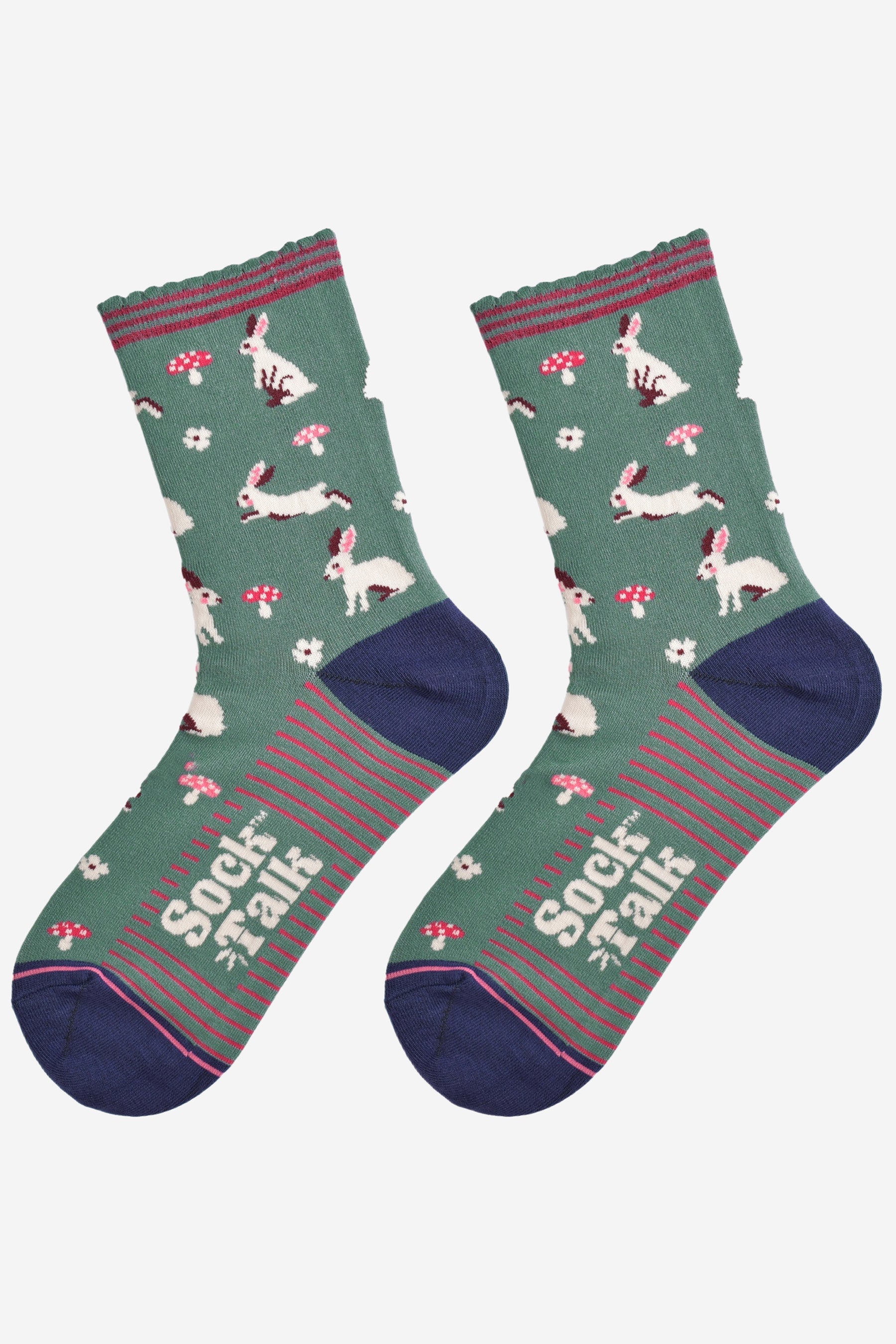 Soft to the touch luxury bamboo socks featuring playful white rabbits and woodland inspired toadstools. In a sage green with a contrasting pink striped scalloped cuff, these socks are designed in the UK and crafted from eco-friendly bamboo.
